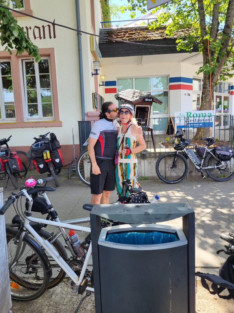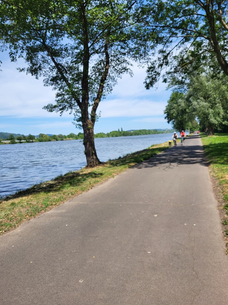 Als die letzten dann geg. 24 Uhr gegangen waren, sind wir auch gleich in die Kiste gefallen. Ich bin nach wenig Schlaf um 7 uhr aufgestanden, weil ich noch am Gepäck einiges ändern musste. Ich hatte wie immer zu Anfang zu viel eingepackt. Bin noch einiges an „unnützen Ballast“ losgeworden und hatte anderes hinzugefügt bis alles gepasst hat. Katrin, mein Töchterlein hatte sich zu einem letzten Kaffee mit Pabba verabredet, Sabine und Markus, Freunde von uns wollten sich noch verabschieden und dann war’s auch schon Zeit loszufahren. Eine letzte Umarmung von Claudia, ein paar Tränchen auf beiden Seiten und schon gings los. 700 m weiter wurde ich von Christine abgefangen für ein letztes Drückerchen. Sie wollte mit dem Rad die kürzere Strecke nach Mettlach nehmen und vielleicht ein Stück mitfahren. Haben uns aber leider nimmer getroffen. Auf den nächsten 200 Meter kamen dann Simone und Andreas entgegen und wir fuhren gemeinsam nach Merzig zum Start der Saarpedal, wo wir uns mit Sylvia und Ralf treffen wollten. Sie standen auch schon parat und nach einer kurzen Begrüßung rollten wir durch den Stadtpark in richtung Saar. Vielleicht nach 30 Meter der nächste Stopp. Edeltrud und Peter ließen es sich nicht nehmen mir noch eine Gute Reise zu wünschen. Wenn das so weitergeht, sagte ich zu Simone, dann bin ich in drei Tagen noch nicht in Trier. Sie tröstete mich, dass das bestimmt in Lappland weniger wird. Schöne Aussichten😅.Nach etwa 500 Metern wie soll’s anders sein? Saßen meine Schwester und Jana auf einer Bank um sich noch ne letzte Umarmung abzuholen. Dann endlich ging es los. Auf dem Treidelpfad neben der Saar konnten wir sage und schreibe ganze 2 km zurücklegen, als es aus einer Gruppe Radfahrender Kinder mit Erwachsenen tönte: Hallo Manni, warte mal…Stefan verabschiedete mich noch und anschließend kamen wir ungehindert ganze 15 km weit bis Mettlach wo wir die erste kleine Pause an einem Bierstand machen wollten. Kaum angekommen ging die Verabschiederei auch schon wieder los. Heinz, eine Brotdorfer Urgestalt wollte wissen wann es denn zum Nordkap losginge. Grad im Moment! antwortete ich. Das bekam Doris, eine Mitinitiatoron der Saarpedal mit. Schnell wurden von Doris von mir und meinem Bike und von Heinz mit seinem Hochrad Fotos gemacht mit dem Versprechen, dass die Reise in der lokalen Presse veröffentlicht wird. Zumindest kurz Erwähnung finden wird. Ich lass mich mal überraschen. Dann wurd es mir zu doll und wir hatten uns fast schon fortschleichen können, als die Band die ihre Songs zum besten gab kurz unterbrach und dem Publikum bekannt gab, welch besonderer Gast die Saarpedal besucht, der eigentlich auf dem Weg zum Nordkap ist. BINGO ! ! ! Jetzt wissen es alle. Mein Tross und ich hatten uns dann schnell von dannen gemacht. Der Rest der Fahrt velief ohne weitere Zwischenfälle. In Saarburg verabschiedeten sich Sylvia, Simone und Andreas und traten den Rückweg an. Ralf fuhr noch bis zur Saarmündung in Konz mit und ist dann auch gleich heimgefahren.