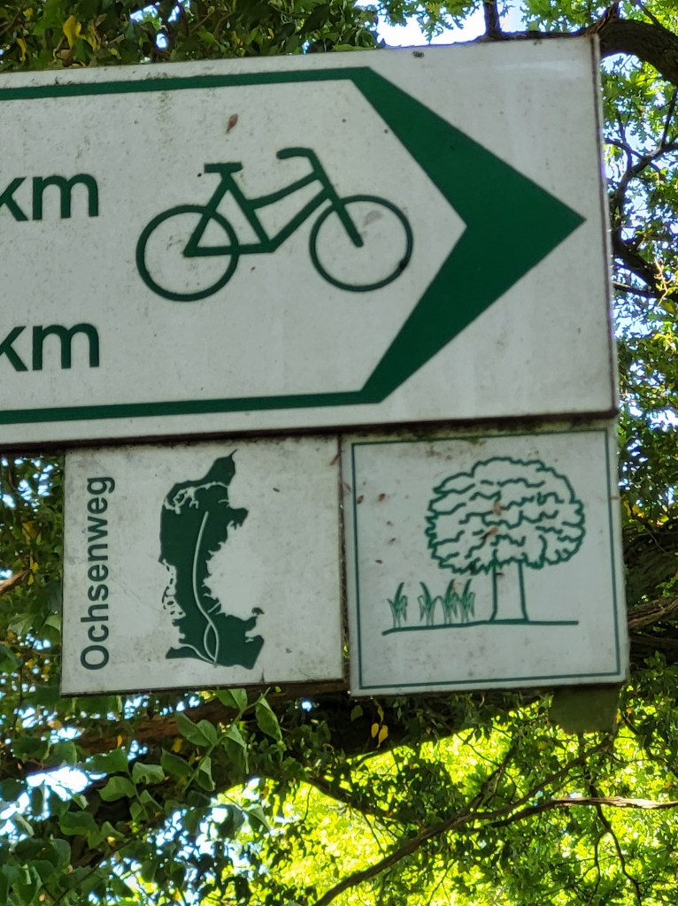 Also machte ich mich gleich auf den Weg. Auf den Ochsenweg. So heißt dieser Weitradweg, der von Hamburg bis Flensburg führt. Ab der dänischen Grenze heißt er dann Ossenweg oder Heervejen und endet an meinem Ziel in Hirtshals. Von der Lanschaft her gesehen, war der heutige Tag ein Genuss. Von der Wegbeschaffenheit eine Katastrophe. Viele Baumwurzeln drängten sich durch Verbundpflaster und Asphalt ins Freie nach oben. Da wurd mir die Bedeutung Ochsenweg ganz deutlich bewusst. Was haben Ochsen nicht, was Stiere haben? Richtich! … wenn ich mit dem ganzen geholpere fertig und am Ziel angelangt bin, gehe ich glattweg als solcher durch. Aber ich will ja nicht gemeckert haben, bin ich doch quasi im Urlaub.
