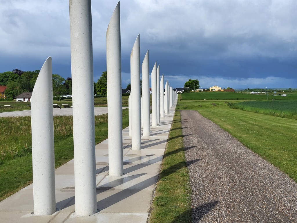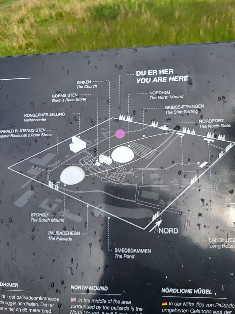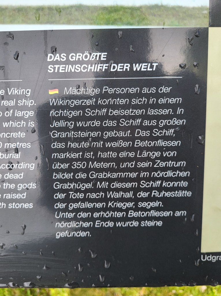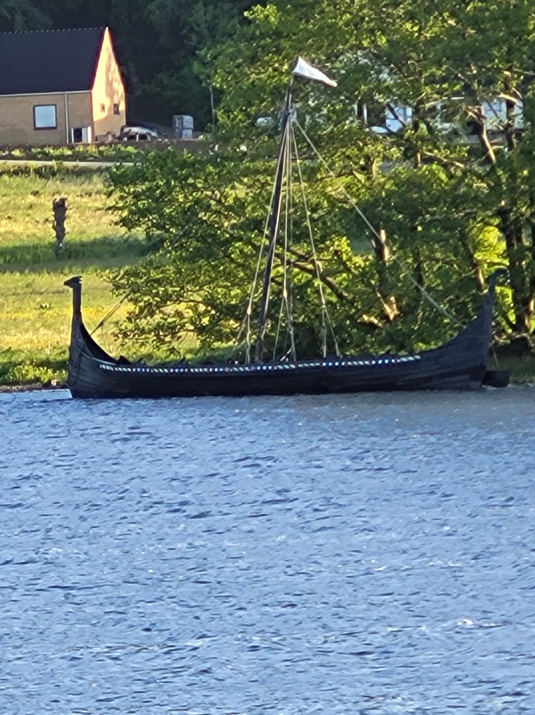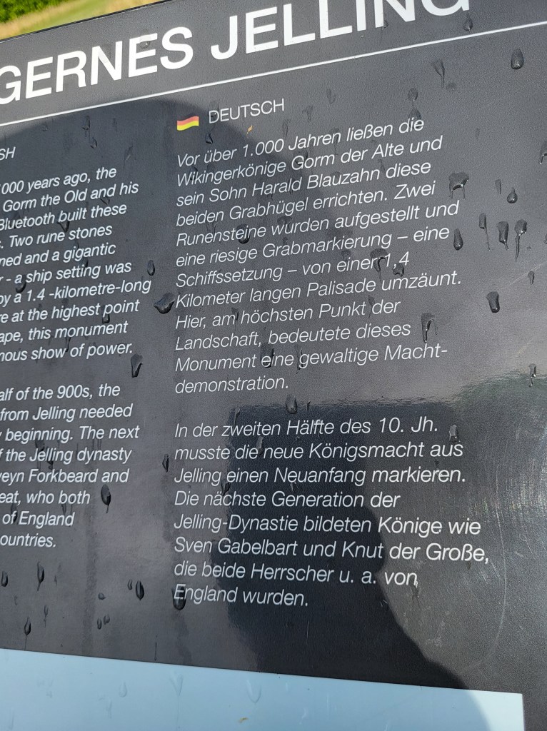 Moin moin, war das eine ruhige Nacht. Wider allen Befürchtungen blieb es doch ruhig. Um halb sieben treibt es mich aus dem Schlafsack und ich schlendere mal zur Rezeption des Campingplatz. Zufällig ist dort eine Angestellte in der Garage zu Gange und ich kann meinen fahrbaren Untersatz früher als gedacht an mich bringen. Schnell zum Zelt zurück und schon mal alles zusammengepackt. Aber das Zelt ist noch zu nass und ich beschließe abzuwarten bis die Sonne drauf scheint. Hab mir erst mal nen Kaffee gekocht und das Gelände näher angeschaut. Der Platz liegt direkt am Ufer des Fårup See. Bei schönem Wetter kann man hier bestimmt einiges unternehmen. Aber zur Zeit sind fast ausschließlich Festivalbesucher anwesend. Die wenigen Urlauber oder Dauercamper haben sich in ihren Burgen verbarrikadiert. Vereinzelt sehe ich welche an ihren Tischen beim Frühstück. Bei den „Rockern“ hört man nur geschnarche. Als ich zurück bin, war das Zelt schon soweit abgetrocknet, dass ich es einpacken konnte. Dann wollte ich zum Kiosk belegte Brötchen kaufen und noch nen Kaffee dazu, aber leider hatte die gute Dame in leidlichen Deutsch gemeint, dass sie keine Sandwichs verkauft. Aber Frühstücken konnte sie mir anbieten. Ja, dann nehm ich Frühstück. Wieviel ich denn haben möchte? Ja seh ich denn so verhungert aus? Nätürlich wollte ich nur ein Frühstück. Sie packte mir das Frühstücken in eine Tüte, den Kaffee drückte sie mir in die Hand und bediente schon die anderen Kunden die etwas ungeduldig hinter mir warteten. Ich setzte mich mit meinem Frühstücken samt Kaffee nach draußen und staunte nicht schlecht als mich ein einzelnes Mohnbrötchen anlachte. Da dämmerte mir, dass es sich um ein Verständigungsmissgeschick (hab soeben ein neues Wort erfunden) handeln konnte. Frühstücken nennt man hier wohl Brötchen. Lass es dir schmecken Manni. Es fing auch noch zu regnen an und mit einem dritten Kaffee hab ich mich unters Vordach der Rezeption verdrückt. Es war bereits halb zehn als ich endlich loskam. Oben im Ort angekommen gab es Kultur auf meiner Cooltour. Hier haben vor 1000 Jahren Wikingerkönig Gorm und sein Sohn Harald Blauzahn, der Erfinder des Bluetoth, besser gesagt der Namensgeber dessen, einen Grabhügel errichtet und ein über 300 meter langes Wikingerboot aus Steinen gebaut. Drumherum wurden auf 1,4 km Länge ein Palisadenzaun gezogen der heute mit riesen Betonpfeiler markiert ist. All das hat mir so gut gefallen, dass ich komplett die Zeit vergaß und um kurz vor Mittag weiterfuhr. Es ist Mittag und ich bin noch keine 5 km weit gekommen. Aber niemand drängt mich. Da das Wetter heute recht viele Schauer versprach und Windgeschwindigkeiten von über 50 km/h angesagt wurden, wollte ich nur eine kurze Etappe hinlegen. Ich kämpfte die nächsten 60 Kilometer gegen dieses Wetter an und hab mich dann in einer B&B Pension eingemietet. Nach dem kargen Frühstücken heut morgen meldete sich doch der Hunger an. Mal sehen was Real Turmat heute so zu bieten hat. Euch allen ein gut’s Nächtle.