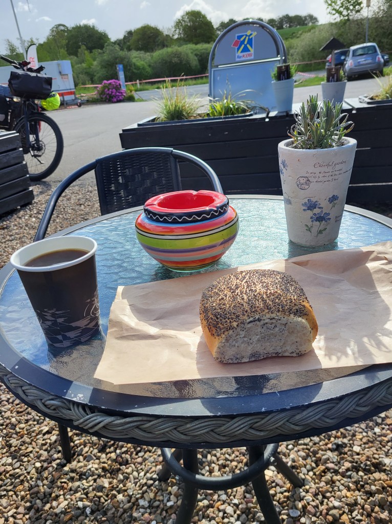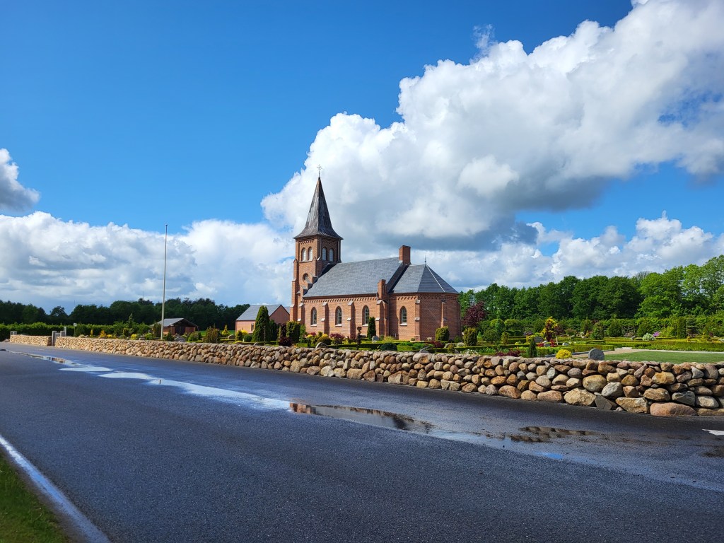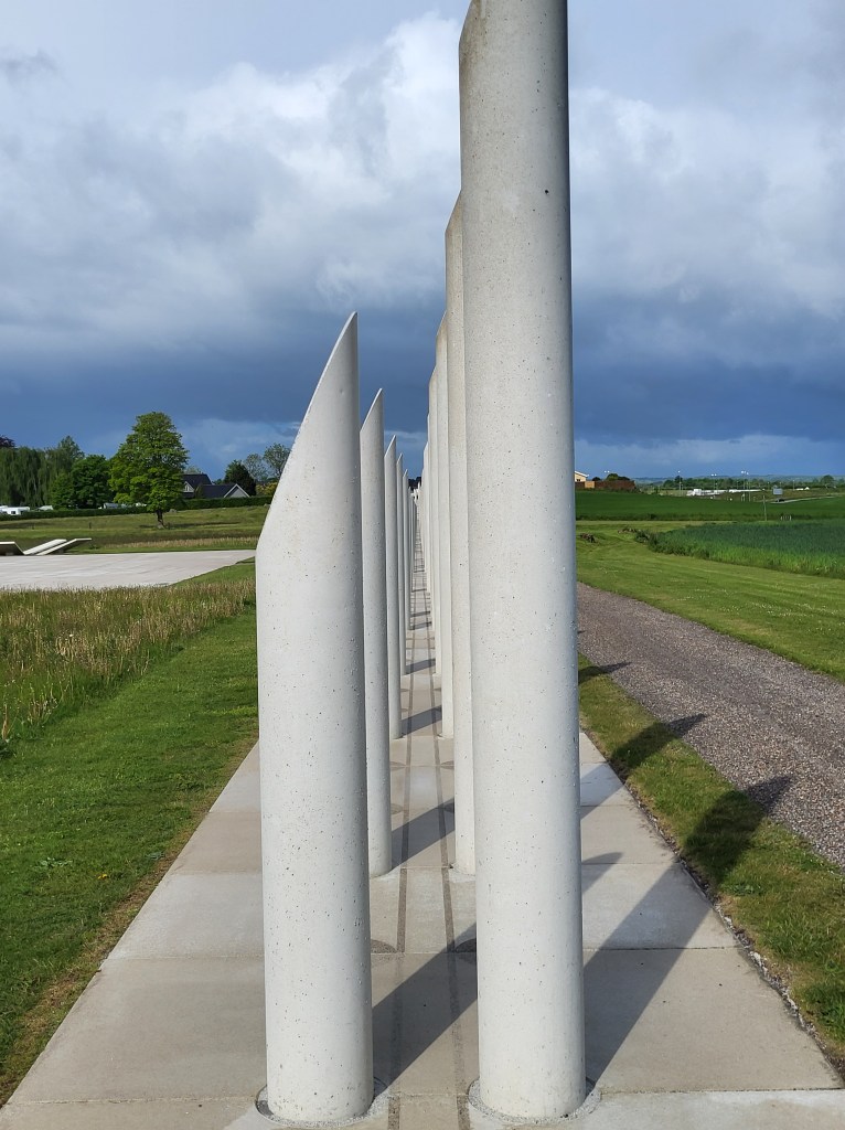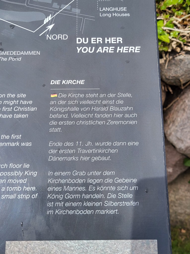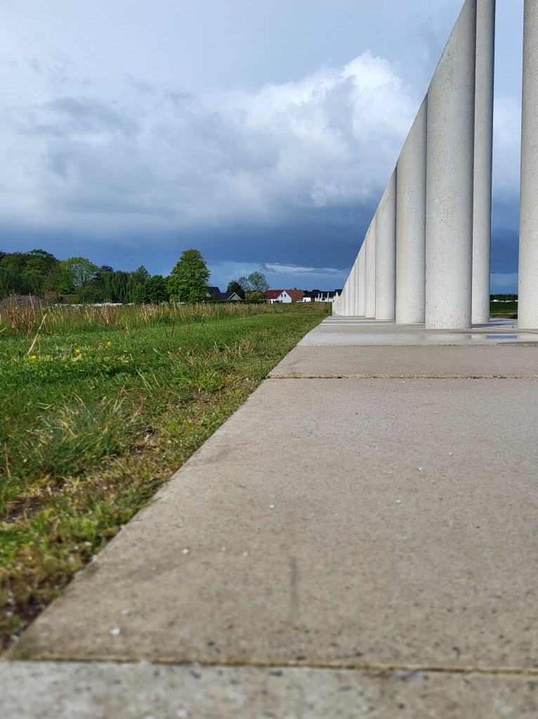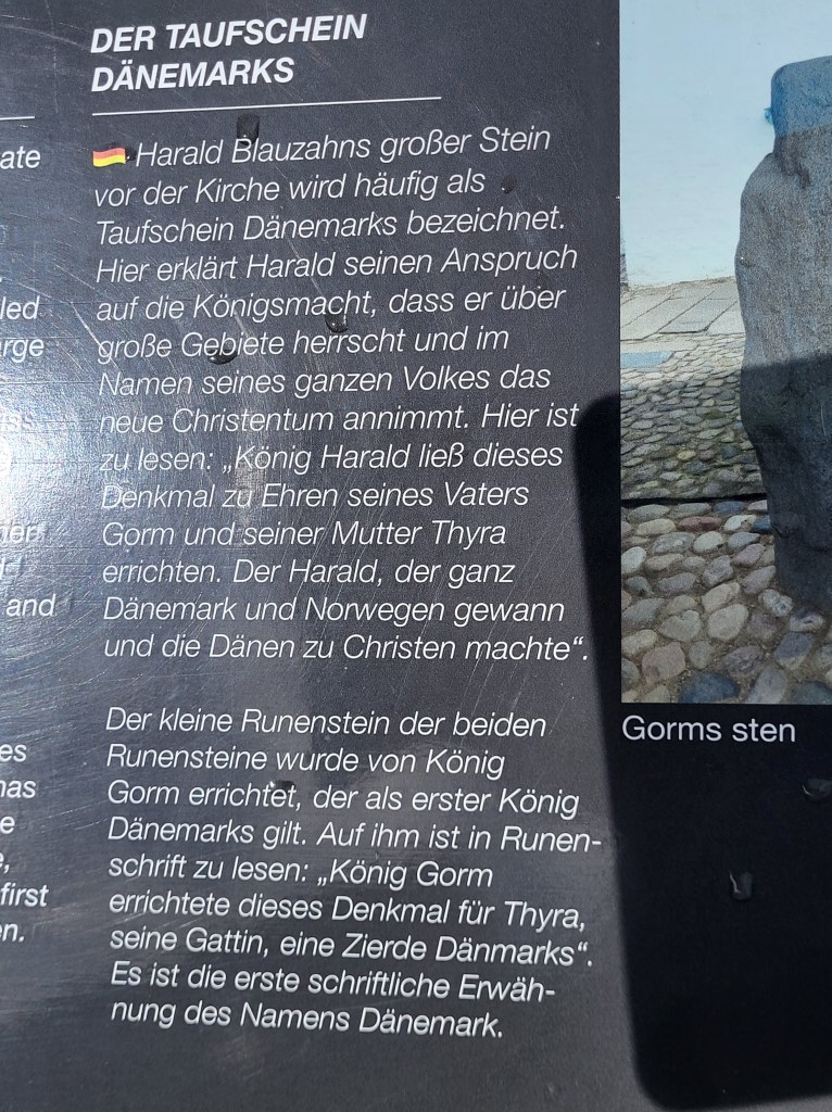Moin moin, war das eine ruhige Nacht. Wider allen Befürchtungen blieb es doch ruhig. Um halb sieben treibt es mich aus dem Schlafsack und ich schlendere mal zur Rezeption des Campingplatz. Zufällig ist dort eine Angestellte in der Garage zu Gange und ich kann meinen fahrbaren Untersatz früher als gedacht an mich bringen. Schnell zum Zelt zurück und schon mal alles zusammengepackt. Aber das Zelt ist noch zu nass und ich beschließe abzuwarten bis die Sonne drauf scheint. Hab mir erst mal nen Kaffee gekocht und das Gelände näher angeschaut. Der Platz liegt direkt am Ufer des Fårup See. Bei schönem Wetter kann man hier bestimmt einiges unternehmen. Aber zur Zeit sind fast ausschließlich Festivalbesucher anwesend. Die wenigen Urlauber oder Dauercamper haben sich in ihren Burgen verbarrikadiert. Vereinzelt sehe ich welche an ihren Tischen beim Frühstück. Bei den „Rockern“ hört man nur geschnarche. Als ich zurück bin, war das Zelt schon soweit abgetrocknet, dass ich es einpacken konnte. Dann wollte ich zum Kiosk belegte Brötchen kaufen und noch nen Kaffee dazu, aber leider hatte die gute Dame in leidlichen Deutsch gemeint, dass sie keine Sandwichs verkauft. Aber Frühstücken konnte sie mir anbieten. Ja, dann nehm ich Frühstück. Wieviel ich denn haben möchte? Ja seh ich denn so verhungert aus? Nätürlich wollte ich nur ein Frühstück. Sie packte mir das Frühstücken in eine Tüte, den Kaffee drückte sie mir in die Hand und bediente schon die anderen Kunden die etwas ungeduldig hinter mir warteten. Ich setzte mich mit meinem Frühstücken samt Kaffee nach draußen und staunte nicht schlecht als mich ein einzelnes Mohnbrötchen anlachte. Da dämmerte mir, dass es sich um ein Verständigungsmissgeschick (hab soeben ein neues Wort erfunden) handeln konnte. Frühstücken nennt man hier wohl Brötchen. Lass es dir schmecken Manni. Es fing auch noch zu regnen an und mit einem dritten Kaffee hab ich mich unters Vordach der Rezeption verdrückt. Es war bereits halb zehn als ich endlich loskam. Oben im Ort angekommen gab es Kultur auf meiner Cooltour. Hier haben vor 1000 Jahren Wikingerkönig Gorm und sein Sohn Harald Blauzahn, der Erfinder des Bluetoth, besser gesagt der Namensgeber dessen, einen Grabhügel errichtet und ein über 300 meter langes Wikingerboot aus Steinen gebaut. Drumherum wurden auf 1,4 km Länge ein Palisadenzaun gezogen der heute mit riesen Betonpfeiler markiert ist. All das hat mir so gut gefallen, dass ich komplett die Zeit vergaß und um kurz vor Mittag weiterfuhr. Es ist Mittag und ich bin noch keine 5 km weit gekommen. Aber niemand drängt mich. Da das Wetter heute recht viele Schauer versprach und Windgeschwindigkeiten von über 50 km/h angesagt wurden, wollte ich nur eine kurze Etappe hinlegen. Ich kämpfte die nächsten 60 Kilometer gegen dieses Wetter an und hab mich dann in einer B&B Pension eingemietet. Nach dem kargen Frühstücken heut morgen meldete sich doch der Hunger an. Mal sehen was Real Turmat heute so zu bieten hat. Euch allen ein gut’s Nächtle.