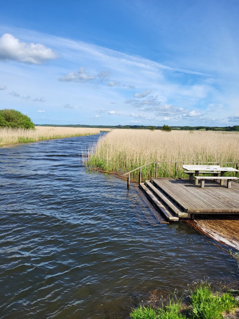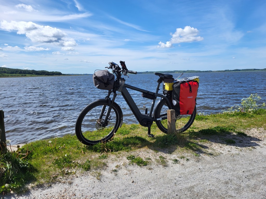 heute Morgen stand in der Pension in Engesvang ein Frühstück vom feinsten. Eine Platte gefüllt mit Wurst, Käse, Paprika und Weintrauben und sage und schreibe 4 Frühstücken und 2 Scheiben Vollkornbrot. Bis auf ein Brötchen hatte ich alles weggeputzt. Die Wurst-Käseplatte, Marmeladen und Honig. Das übrige Brötchen schmierte ich mir für unterwegs. Ich war so ausgehungert nach dem kargen Frühstücken von gestern morgen und zu Mittag gab’s ja nur ein paar Nüsse und abends eine Tüte der Treckingnahrung. Nudeln mit vegetarischem Hackfleisch. Frisch gestärkt machte ich mich gegen 9 uhr auf den Weg zum Supermarkt, wo ich mich mit Essen fürs Wochenend eindeckte. Das Wetter zeigte sich heute von einer schöneren Seite. Zwar war’s noch etwas kühl aber dafür trocken und der Wind blies mir heute nicht so stark entgegen und wenn die Sonne sich zeigte wurd es sogar richtig warm. Alles in allem war es heute angenehm zu fahren. Von Engesvang ging es vorbei am Bolling See in Richtung Kragelund wo ich wieder auf den Hærwejen stieß. Diesem folgte ich bis Hald Ege, wo ich am Hald See nach etwa 35 km meine erste Pause einlegte. Weiter ging es nach Viborg, wo ich den Hærvejen endgültig verließ und auf dem Fernradweg Nr 2 weiterfuhr. Schon nach 15 km bog dieser auf den Radweg Nr. 12/35 ab wo ich heute zum ersten mal auf dieser Tour das Meer zu Gesicht bekam. Besser gesagt das Ende vom Hjarbæk Fjord. In Aalestrup kam ich an einem Shelterplatz für Zelte vorbei und in einem etwas runtergekommenen Sanitärgebäude gabs Stromanschluss, was mich davon überzeugte, dass es besser ist, mein Nachtlager hier aufzuschlagen. Alles in allem war’s ein schöner ruhiger Tag gewesen.