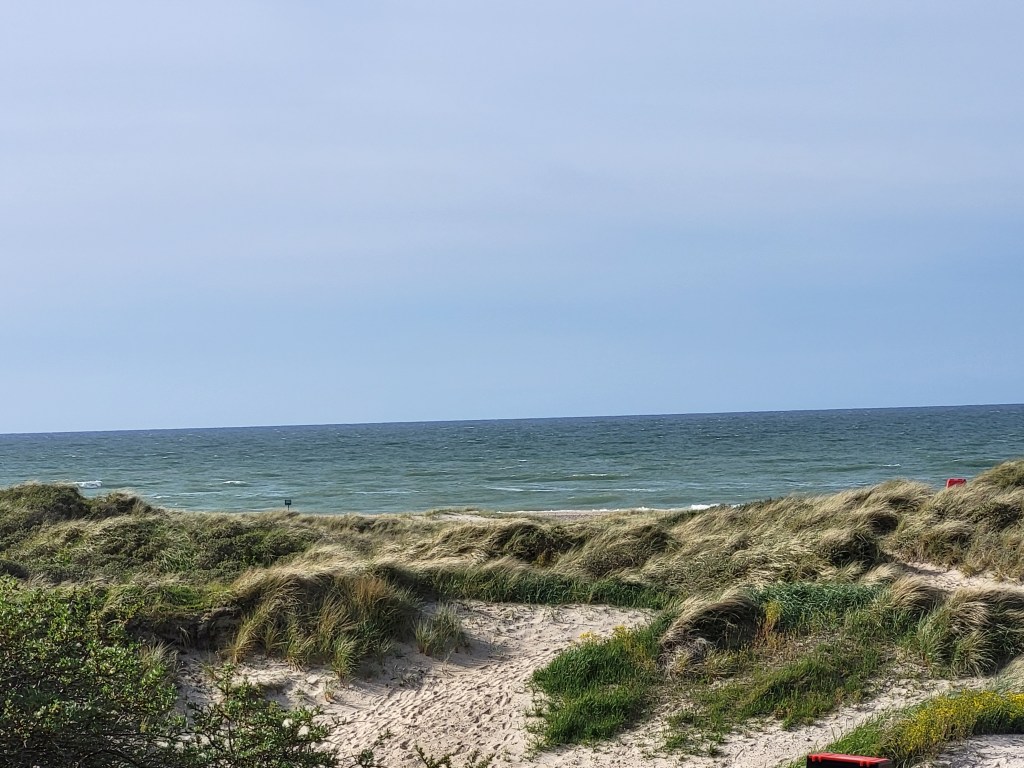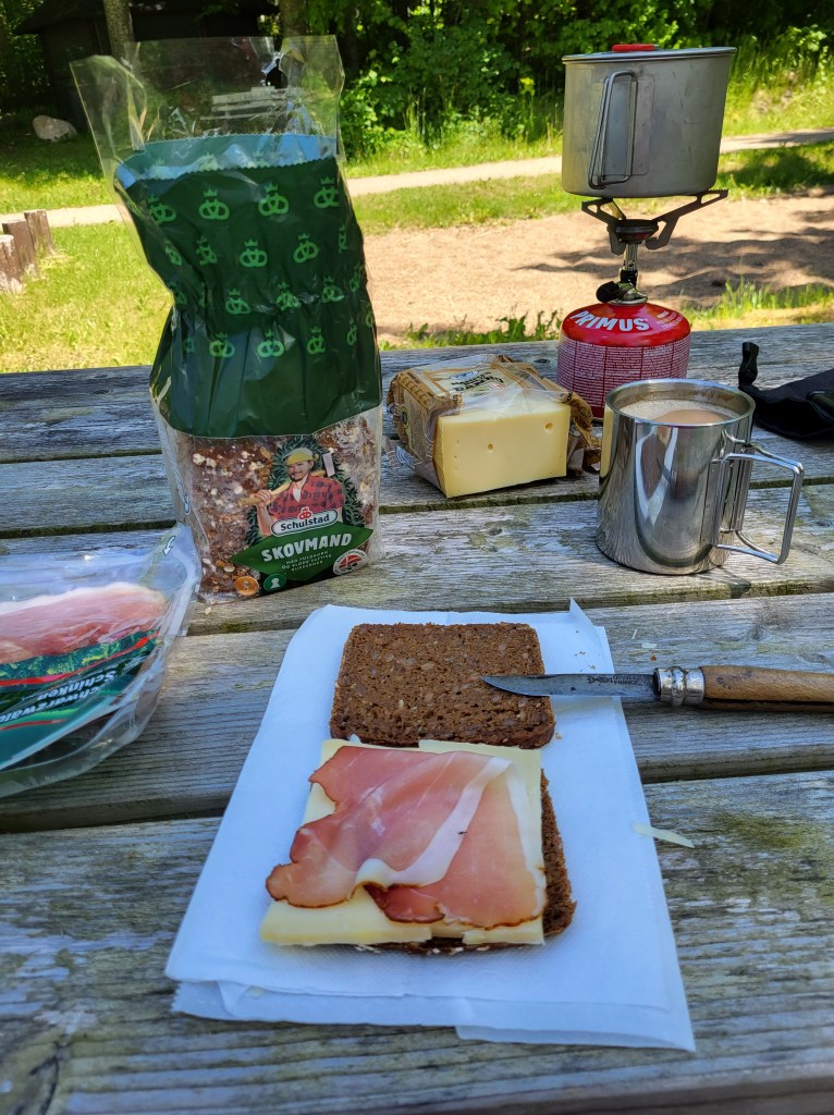 Heute bin ich erst um 8 Uhr aufgewacht. Meine Zeltnachbarn sitzen schon beim Kaffee und sind sich munter am unterhalten. Ich verstehe kein dänisch, aber wahrscheinlich unterhalten sie sich übers Angeln. Deswegen sind sie ja zum Wochenende hier hergekommen. Ich versuche etwas Ordnung im Zelt zu bekommen, lass es dann aber sein und quäle mich aus dem inneren meines warmen Schlafsacks und des Zeltes. Hatte gestern Abend versäumt das Zelt nochmal nachzuspannen und deshalb haben sich heut nacht Außen und Innenzelt berührt und jetzt hab ich den Salat. Das Innenzelt ist feucht. Muss es also erst abtrocknen lassen bevor ich mich auf den Weg mache. Zeit mein Gerümpel neu zu sortieren, aber erst koch ich mal Kaffee und frühstücke was. Das heißt, es gibt nur 2 Müßliriegel. Egal, muss für’serste reichen. Hauptsach Kaffe! Mittlerweile leert sich der Platz. Einer nach dem anderen macht sich von dannen, bis nur noch ich übrig bin. Das Zelt ist gegen 10h30 soweit getrocknet, dass ich es abbauen und verstauen kann. Die restlichen Sachen zusammen gerafft und auf gehts. Nach etwa 10 km komme ich an einem Netto vorbei, der doch tatsächlich am heiligen Sonntag geöffnet hat. Wie ich später bemerkte, haben alle größeren Geschäfte geöffnet und ich sehe dass hin und wieder auch ganz normal gearbeitet wird. Man merkt kaum dass Sonntag ist. Ich schaue doch tatsächlich im Kalender nach, aber es bleibt bei Sonntag. Ein Phänomen dass sich bei mir auf Langtouren regelmäßig einstellt, ist, dass ich die Wochentage vergesse. Auf dem Jakobsweg in Spanien hatte ich mich mal darüber gewundert, wieso ein Formel 1 Rennen mitten in der Woche live übertragen wird. Die Zeit wird dabei ganz nebensächlich. Was zählt ist das hier und jetzt. Also, wie gesagt, Netto offen, ich rein. Hier kaufe ich mir dänischen Käse, dänischen Schwarzwälder Schinken und dänische Bananen. Der Umwelt zuliebe kaufe ich gerne regional ein. Ach ja und dänisches Wasser aus Tönisstein kommen auch noch mit. Die Flaschen füll ich sogleich in meine Getränkeflaschen um und bringe das Leergut zum Pfandautomaten. Den Bon lege ich auf eine Ablage und diejenigen die ihn finden dürfen sich gerne über ein paar Kronen freuen. 2 Mädels, etwa 10 Jahre alt beobachteten wie ich den Zettel hinlegte und Richtung Ausgang verschwinde. Sie schauten mir zu was ich denn jetzt so mache, ob ich wieder zurückkomme oder sonst irgendwie reagiere. Ich war dabei meinen Einkauf zu verstauen und schmunzelnd beobachtete ich aus den Augenwinkeln heraus wie die eine den Zettel an sich nahm und die andere Schmiere stand. Schwuppdiwupp waren beide auf einmal verschwunden, nur um Augenblicke später wieder ganz entspannt Laden zielstrebig zur Kasse zu gehen. Was für ein Abenteuer für die Beiden…