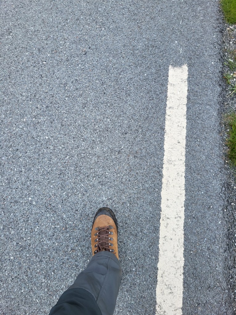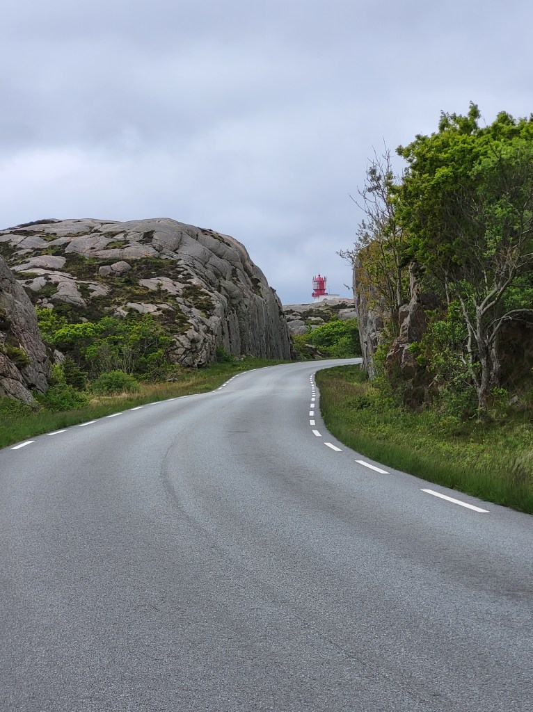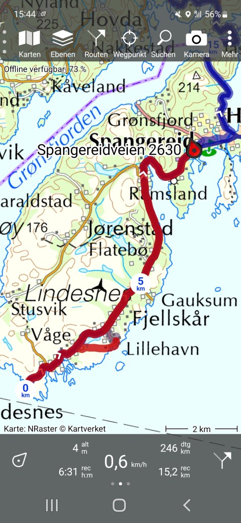 Nachdem ich heute Nacht noch einmal den Luxus einer Campinghütte genießen durfte, machte ich mich geg. 10 Uhr auf den Weg zum Lindesnes Leuchtturm um mich in das offizielle NPL-Buch einzutragen. Denn hier ist auch der offizielle Start für Norge på langs-Läufer. Ich hatte mich gestern per E-mail angemeldet und der Leuchtturmwärter erwartete mich schon. Ich machte den Eintrag in das Buch und der gute Mann machte noch Fotos von mir am und auf dem Leuchtturm. Er erzählte mir noch etwas über die Geschichte des Turms und bald machte ich mich auf den Weg. Ich gönnte mir noch einen Café und ein Hambürgerchen mit Minifrikadelchen und Salatblättchen für richtig viel Kohle und erzählte dem Mann am Tresen von meinem Vorhaben. Er drückte mir zum Abschied noch eine dicke Waffel in die Hand und verabschiedete mich recht herzlich. Dann das obligatorische Startfoto am Wegweiser zum Nordkap gemacht und ganz wichtig! Meinen Startschluck aus dem eigens dafür mitgebrachtem Flachmann mit hochprozentigem Mirabellenschnaps. Den Rest trinke ich erst, wenn ich mein Ziel erreicht habe. Mit meiner 15 kilo-Schrankwand auf dem Rücken entschwand ich dann erst mal Richtung Spangereid wo ich inklusive Pause nach etwas mehr als 2½ Stunden eintraf. Ich hatte bewusst eine kurze Distanz gewählt, um mich langsam an das Gehen mit schwerem Gepäck zu gewöhnen. Bisher bin ich ja über zwei Wochen mit dem Rad gefahren und ich merkte besonders in den Hüftgelenken, dass es doch anders ist. Deshalb versuche ich mein Tempo und die Entfernungen langsam zu steigern. Möchte ja nicht, dass ich gleich zu Anfang wieder abbrechen muss. Bin ja nicht mehr der jüngste.