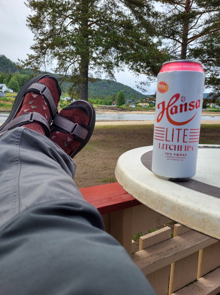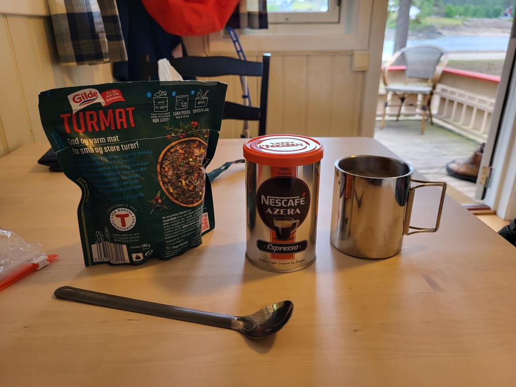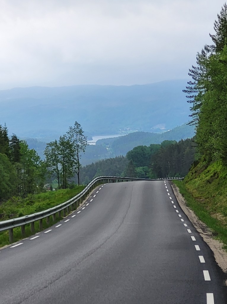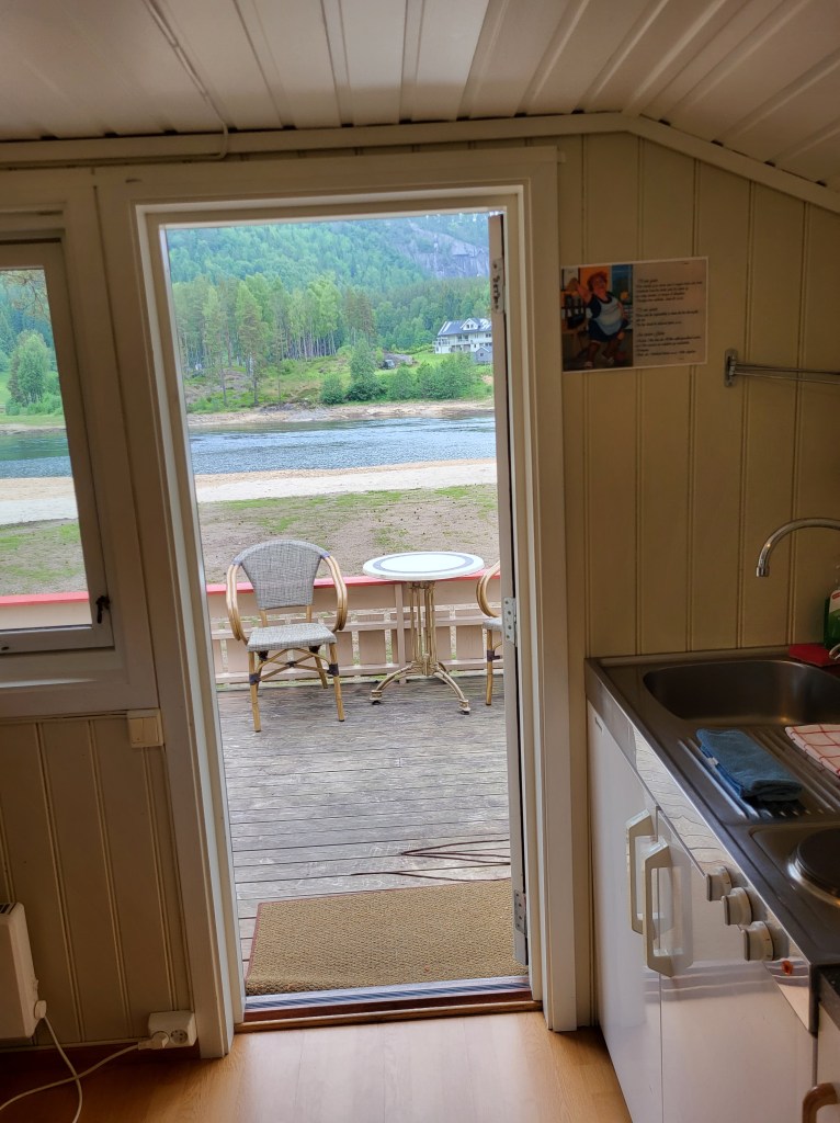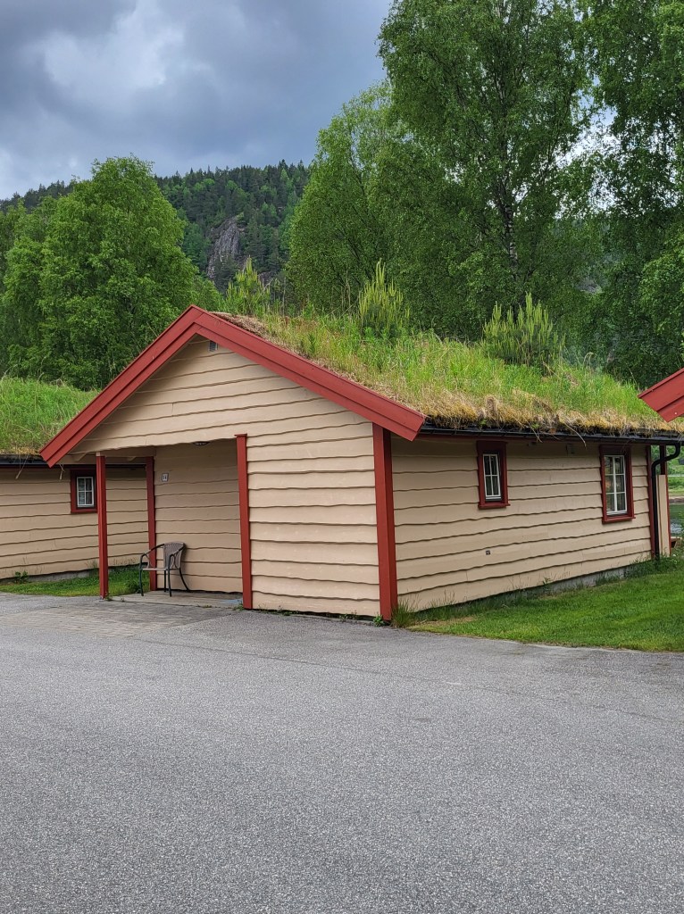 Habe heute Nacht schlecht geschlafen. Der Wetterdienst hat für heute Dauerregen angekündigt und in der Nacht tröpfelt es hin und wieder, aber sonst merk ich nicht viel. Um 5 Uhr stehe ich auf um das Zelt trocken abzubauen bevor der große Regen kommt. Aber der lässt den ganzen Tag auf sich warten. Ich ziehe so gegen 6 uhr los und komme irgendwie nicht in die Gänge. Zu allem Übel geht es auf einer Strecke von 4 km stetig bergauf. Bleibe öfters stehen und irgendwie fehlt mir heute die Kraft. Das liegt wohl daran, dass ich gestern nicht genug gegessen und heute ohne Frühstück losgegangen bin. Aber ich verspüre keinen Hunger und kriege nix runter. Wenn das mal zu Hause so wäre…😅 Auch ist irgendwie die Stimmung voll unten und so trotte ich die Straße lang und an einer Pferdekoppel sieht mich eins der Tiere und kommt auf mich zu und wiehert mir ein Hallo entgegen. Es lässt sich sogar anfassen und streicheln und dann rede ich doch tatsächlich mit dem Pferd. Es ist ein guter Zuhörer. Dann trabe ich weiter und schon geht’s mir besser. Gegen 12 Uhr erreiche ich endlich einen Vorort von Evje und stelle fest, dass es noch 4½ km bis zum Campingplatz sind. Hansjörg aus der Schweiz der mit seinem Fahrrad Richtung Lofoten unterwegs ist, schreibt mir, dass er damals, als er vor fünf Jahren NPL gelaufen ist, in Evje am Campingplatz günstig eine Hütte gemietet hat und mir den Platz wärmstens empfehlen kann. Ca 500 m vor besagtem Platz geht mir die Puste aus. Ich muss mich irgendwo hinsetzen und was warmes trinken. In einer kleinen Tankstelle frage ich nach Kaffee und ob ich mich kurz hinsetzen dürfte. Den Kaffee und den Stuhl gab’s für umsonst und irgendwie schmachtete ich nach einer Belohnung. Ich nehm mir ein Lakritzeis aus der Truhe, bezahle es und sauge es fast mit Verpackung in mich rein. Schmeckt besser als gedacht. Danach ging es wieder gestärkt weiter auf die letzten 500 Meter zu meinem Ziel. Dann setzte auch der angekündigte Regen ein . Ich saß da aber schon in der trockenen Hütte und mache mir ein undefinierbares Treckingessen warm. Da erst merkte ich wie hungrig ich doch war. Es ist wieder alles beim alten. Dann machte ich eine Stunde lang nix außer drei Kaffees zu trinken. Feiner löslicher Nescafe, den ich zu Hause nie trinken würde. Aber hier draußen, ist er ein wahrer Genuss.
