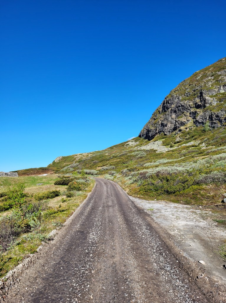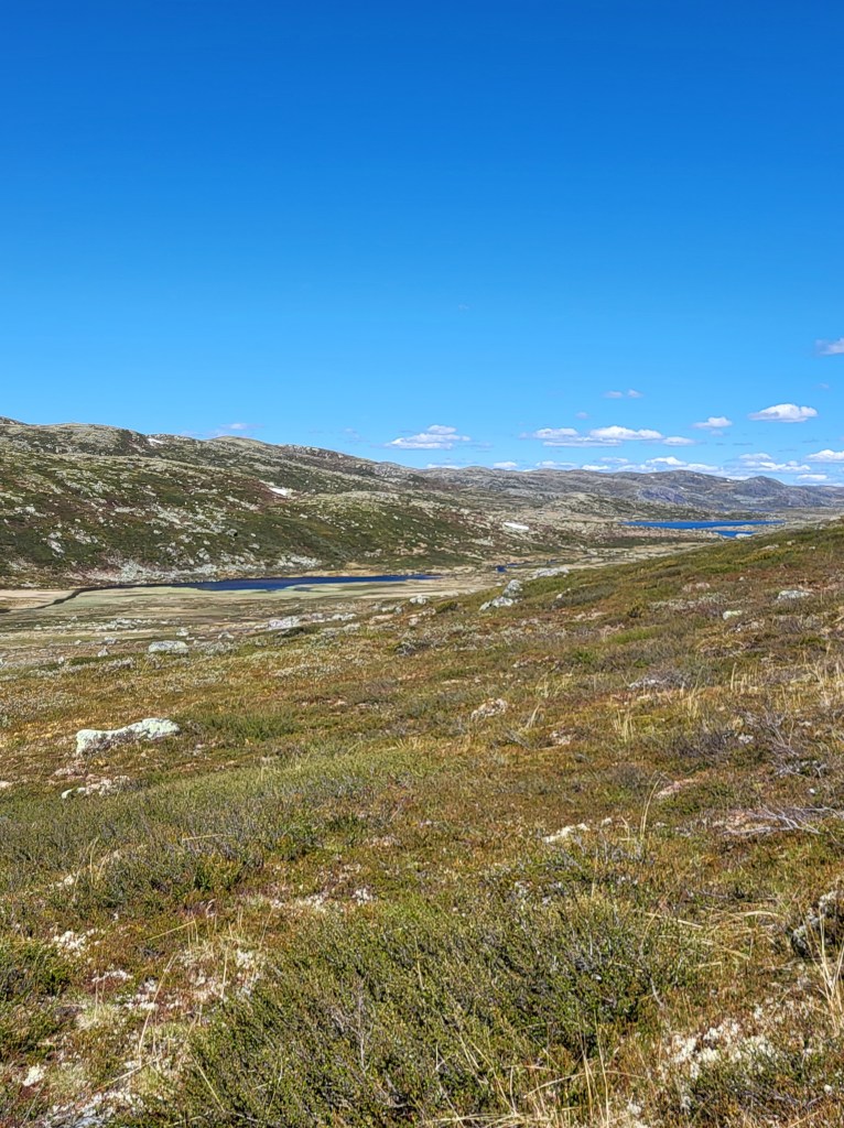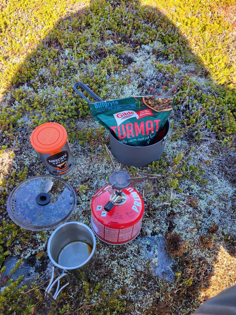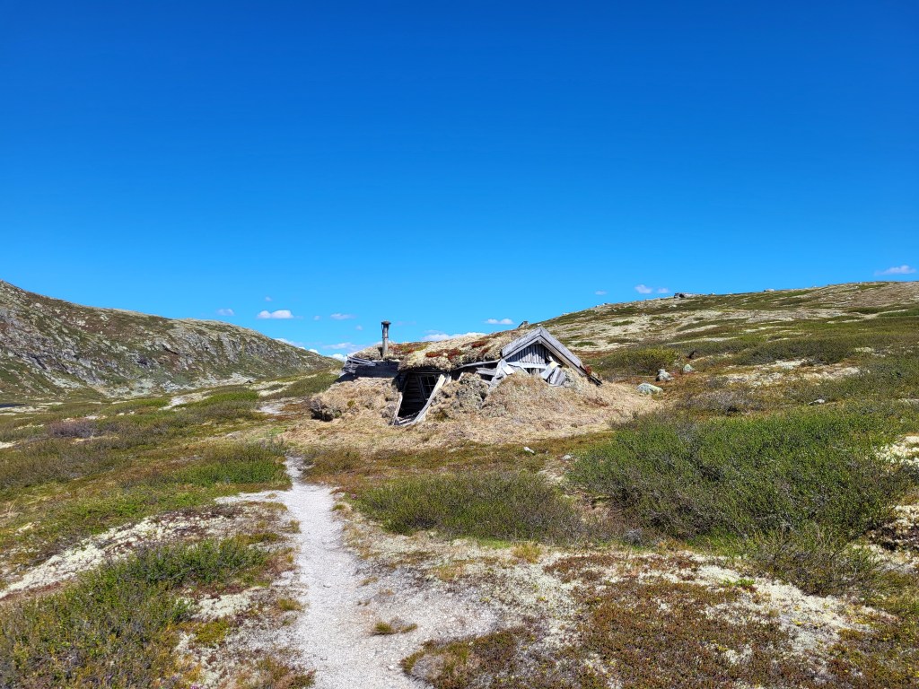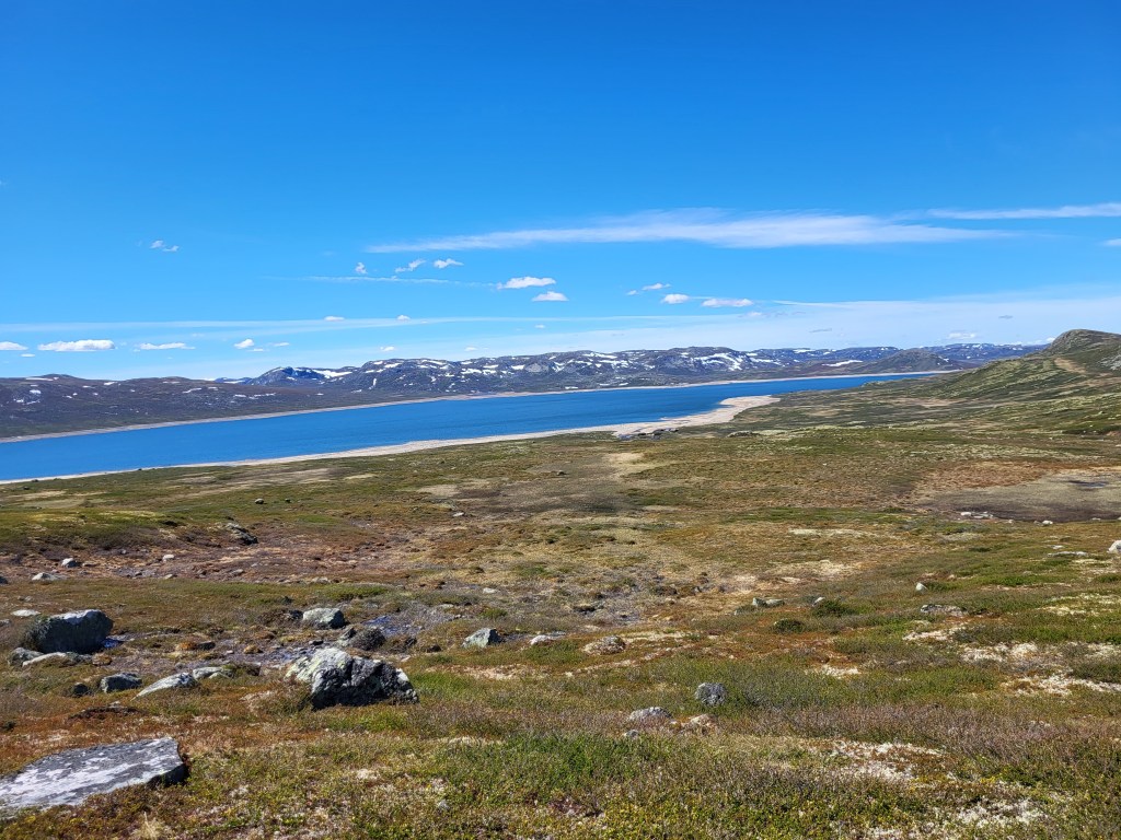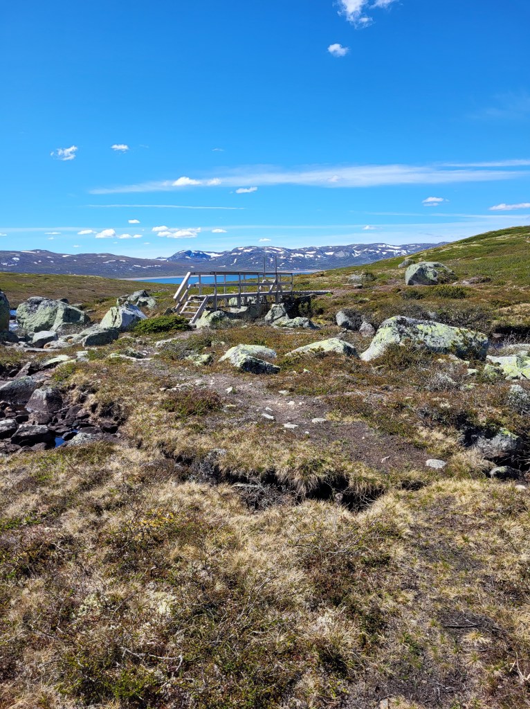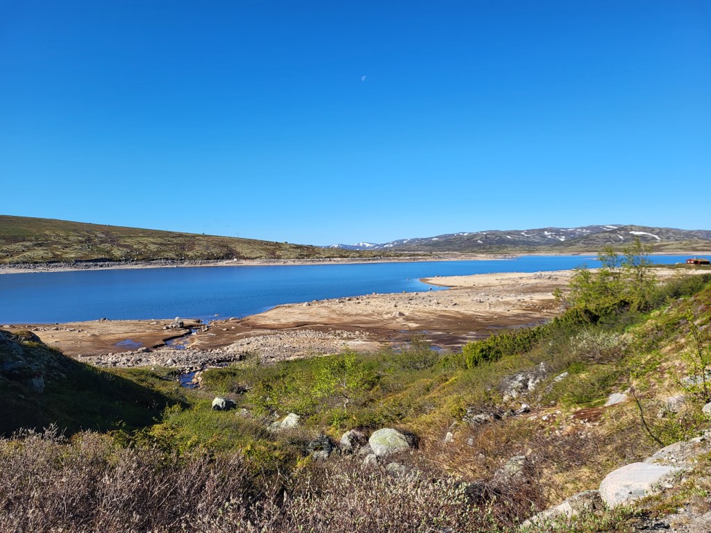 Die deutsche NPL-Läuferin mit der ich die letzten zwei Abende die Hütte geteilt habe ist schon vor mir aufgebrochen. Ich habe auf der Karte gesehen, dass parallel zum Wanderweg etwas tiefer gelegen ein Radweg am Mår-See entlang läuft, der dann in einer Fährpassage über den See ab Synken nach Marbu zu meinem heutigen Ziel führt. Da der gestrige Weg etwas strapaziös gewesen war, dachte ich mir, dass eine Bootsfahrt ja auch ganz lustig sei. Nach 5 Kilometer hätte ich wieder Gelegenheit gehabt um auf dem regulären Wanderweg einzusteigen. Obwohl mir der niedrige Pegelstand des See bedenklich erschien und es mehr als fraglich war, ob denn das Boot überhaupt fährt, wollte ich es ganz genau wissen und machte mich auf den Weg zum Bootsanleger, der ja nur 2,5 km von der Strecke abwich. Was sind schon 2,5 km auf einem Radweg? Tatsächlich traf ich dort den Eigner an, der zugleich Mechaniker und Bootsführer war. Ich fragte ihn, wann denn die Fähre heute fährt. Er hat mir bloß einen Verständnislosen Blick zugeworfen und fragte mich, ob ich hier irgendwo in dem kleinen Hafen Wasser sehe. Das Boot, an dem er am schrauben war, war übrigens die Fähre und die lag auf einem Gestell gestützt im trockenen. Der Mann meinte, dass es in den letzten 5 Jahren so wenig Schnee in der Vidda gab, dass fast alle Seen und Flüsse kaum oder wenig Wasser führten und dass die Saison für ihn schon jetzt gestorben sei. Da realisierte ich, dass ich mich in eine miese Lage gebracht hatte. Wollte ich die Hütte noch erreichen, musste ich von jetzt an Gas geben. Nächster Fehler: Um nicht die zweieinhalb Kilometer zurücklaufen zu müssen, wählte ich den Weg quer durchs trockene Seebett um im geraden Stich auf der anderen Seite den Berg hochzuwandern und dort wieder auf den richtigen Weg zu stoßen. Ich wandelte wie Moses durch ein trockenes Meer und fühlte mich auch so. In der Biebel stand aber nicht, dass so ein sandiger Grund nur schwer zu begehen ist. Aber die hatten ja die Ägypter im Nacken und ich bloß die verlorene Zeit. Am andern Ufer angekommen, dachte ich, jetzt nur noch die 100 m Höhenunterschied querfeldein hochstiefeln und schon biste wieder auf dem rechten Pfad. Laut Karte, hätte ich zwischen zwei Sumpffeldern hindurch gekonnt. Aber die Sümpfe halten wohl nix von Topografie und schlossen sich zu einem großen Ganzen zusammen. Völlig platt und ausgelaugt kam ich bei Km 7 auf dem Pfad an, hatte aber schon 12 km auf dem Tacho und es war schon 14 uhr durch. Weitere 12 km würde ich unter schweren Bedingungen nicht mehr schaffen und so suchte ich mir ab Km 10 einen geeigneten Platz zum Zelten und wurde auch fündig in der Nähe eines Baches, wo ich wenigstens mit Wasser versorgt war. Ich machte mir noch eine Packung Tur Mat warm, brauner Labskaus. Ich kann das Zeugs nicht mehr sehen, aber ich brauch diese Kalorienbomben um den nächsten Tag zu überstehen. Ähnlich verhält es sich mit dem Frühstück. Ich mochte früher Haferflocken sehr gerne, aber jeden morgen mit Milchpulver und Wasser angerührt würge ich das Zeugs nur so runter. Wer mich kennt weiß dass ich gerne esse und auch alles außer Rote Beete, doch nie hätt ich mir träumen lassen, dass ich mal essen muss! Also rein mit dem Labskaus, schütte noch nen löslichen Kaffee hinterher und ab in den Schlafsack. Nein! Nicht das Essen! Ich natürlich.