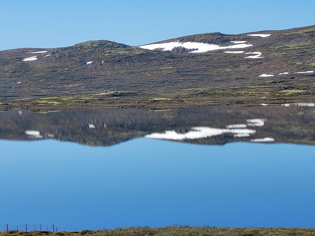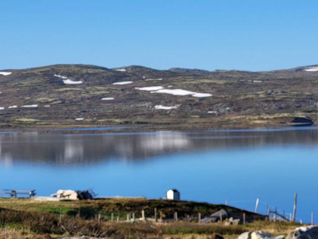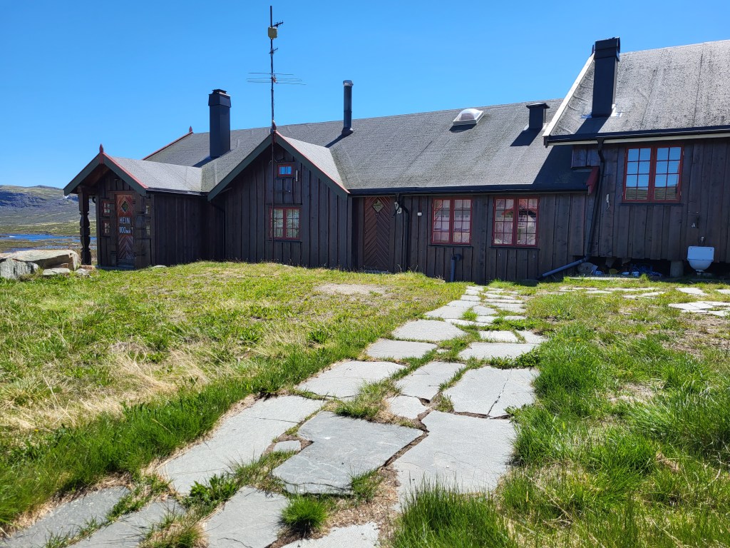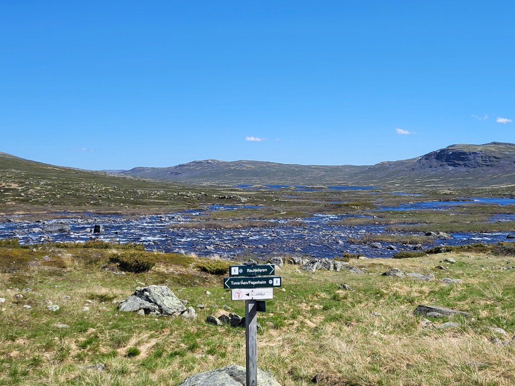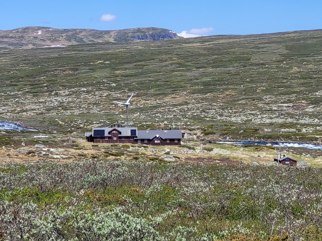 Heute ist Mittsommer in Norwegen und wird in Städten und Ortschaften meist gefeiert. Doch davon kriegen wir im Fjell nichts mit, außer dass zu diesem Zeitpunkt die meisten Hütten die Sommersaison beginnen und ihre Pforten öffnen. Ich bin schon früh wach, packe meine Sachen zusammen, räume die Hütte auf, mache sauber und mache mich dann auf den Weg. Das Wetter zeigt sich von seiner besten Seite. Kein Wind und es sollen 21° warm werden. Schon fast zu warm zum wandern. Unten bei den Arbeiter regt sich auch schon was. Ich fülle mir im Waschhaus meine Trinkblase, verstaue sie im Rucksack und bemerke wie mich einer der Leute fotografiert. Er kommt dann auch sogleich auf mich zu und erklärt mir, dass er Reporter sei und für das bevorstehende Jubiläum der Hütte eine Reportage macht. Die Hütte feiert demnächst ihr hundertjähriges Bestehen und ich hätte gute Chancen auf die Titelseite der Jubiläumszeitschrift der Rauhellerenhütte zu gelangen. Er fragt ob ich über Heinseter nach Geilo gehen will und sagt mir, dass die Heinhütte noch geschlossen sei, aber die nächste, die Tuva Turisthytta vielleicht schon geöffnet hat. Der Weg lässt sich heute gut gehen. Auf den ersten fünf Kilometern führt er mich am Djupafluss entlang und es ist seit langem das erste mal dass der Fluss die selbe Laufrichtung hat wie ich. Es geht also zum größten Teil bergab, die Pfade lassen sich fast wie ein Feldweg laufen. Kaum Geäst und Fels die das Laufen erschweren behindern mich heute. Nachdem ich nach 5 Kilometer den Fluss verlasse, geht es kurz 100 Höhenmeter hinauf um gleich wieder runter zu gehen. Gegen 14 Uhr erreich ich die Hein Hütte und ist wie erwartet noch geschlossen. Es ist niemand anwesend der auf eine baldige Öffnung schließen lässt. Die Hütte ist Privat und hat somit auch keinen unbedienten Teil wie bei den DNT-Hütten, wo ich mit dem Schlüssel reinkomme. Ich schaue mich auf dem Gelände um und finde in der Mitte der Gebäude eine ebene Stelle wo ich mein Zelt aufbauen kann. Dies ist zwar nicht erlaubt, aber es ist auch keiner da, der mich verjagen könnte. Im Windschatten eines der Gebäude bereite ich mir mein Essen zu. Als Tisch dient mir hierfür ein Stapel Europaletten. Es gibt Pasta Napoli aus der Tüte. Heißes Wasser drauf, 20 min ziehen lassen und genießen. Ich beschließe mit dem Zeltaufbau noch etwas zu warten. Für den Fall, dass doch noch jemand auftaucht. Gegen 19 uhr stelle ich es auf dem Stückchen Wiese auf und ich bin kaum fertig, stehen plötzlich eine Frau und ein Mann mit leichten Tagesrucksäcken vor mir ohne dass ich ihr kommen bemerkt hätte. Ich hab mich fast zu Tode erschrocken und stammele ein Hallo hervor. Aber die beiden sind nur Tageswanderer die vor 4 Std von ihrem Standort irgendwo aufgebrochen sind und gehofft hatten dass die Hütte offen sei und sich insgeheim auf ein Eis gefreut haben. Die beiden kommen aus Sachsen und machen mit ihrem VW Transporter, den sie als Basis benutzen Wanderurlaub. Sie fragen wie ich denn hierher gekommen sei und wieso ich in einem Zelt übernachte. Für sie war es unvorstellbar, dass man die Hardangervidda zu Fuß durchqueren kann. Als sie dann weg waren, gab es eine Portion braunen Labskaus zum Abendessen und ich verzog mich ins Zeltinnere. Bin trotz des auffrischenden Windes gleich eingeschlafen und nichts und niemand störte meine Nachtruhe.