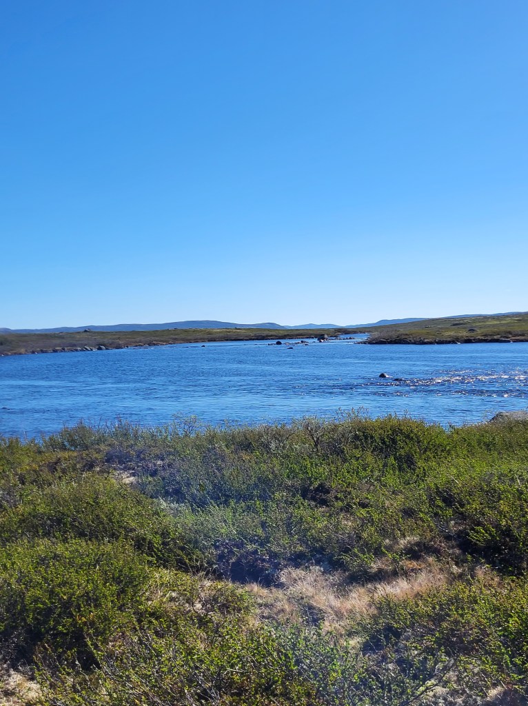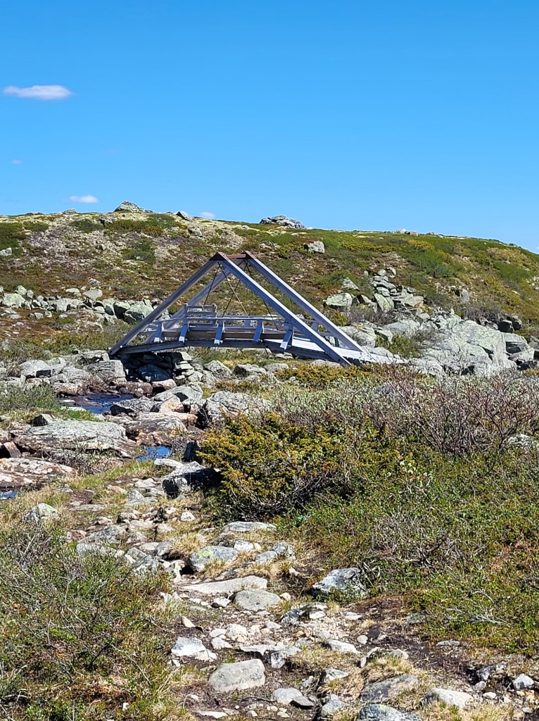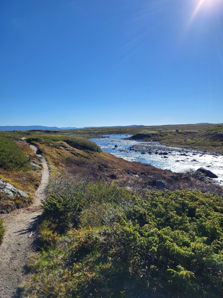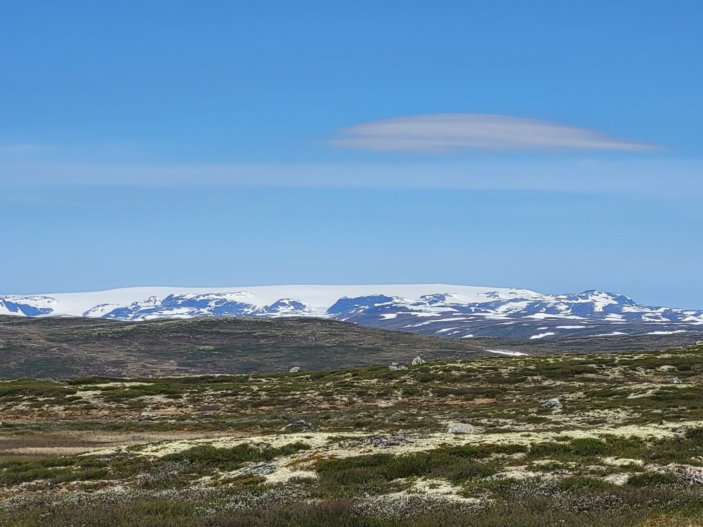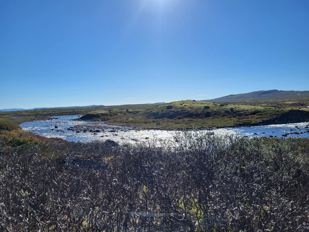 Heute ist Mittsommer in Norwegen und wird in Städten und Ortschaften meist gefeiert. Doch davon kriegen wir im Fjell nichts mit, außer dass zu diesem Zeitpunkt die meisten Hütten die Sommersaison beginnen und ihre Pforten öffnen. Ich bin schon früh wach, packe meine Sachen zusammen, räume die Hütte auf, mache sauber und mache mich dann auf den Weg. Das Wetter zeigt sich von seiner besten Seite. Kein Wind und es sollen 21° warm werden. Schon fast zu warm zum wandern. Unten bei den Arbeiter regt sich auch schon was. Ich fülle mir im Waschhaus meine Trinkblase, verstaue sie im Rucksack und bemerke wie mich einer der Leute fotografiert. Er kommt dann auch sogleich auf mich zu und erklärt mir, dass er Reporter sei und für das bevorstehende Jubiläum der Hütte eine Reportage macht. Die Hütte feiert demnächst ihr hundertjähriges Bestehen und ich hätte gute Chancen auf die Titelseite der Jubiläumszeitschrift der Rauhellerenhütte zu gelangen. Er fragt ob ich über Heinseter nach Geilo gehen will und sagt mir, dass die Heinhütte noch geschlossen sei, aber die nächste, die Tuva Turisthytta vielleicht schon geöffnet hat. Der Weg lässt sich heute gut gehen. Auf den ersten fünf Kilometern führt er mich am Djupafluss entlang und es ist seit langem das erste mal dass der Fluss die selbe Laufrichtung hat wie ich. Es geht also zum größten Teil bergab, die Pfade lassen sich fast wie ein Feldweg laufen. Kaum Geäst und Fels die das Laufen erschweren behindern mich heute. Nachdem ich nach 5 Kilometer den Fluss verlasse, geht es kurz 100 Höhenmeter hinauf um gleich wieder runter zu gehen. Gegen 14 Uhr erreich ich die Hein Hütte und ist wie erwartet noch geschlossen. Es ist niemand anwesend der auf eine baldige Öffnung schließen lässt. Die Hütte ist Privat und hat somit auch keinen unbedienten Teil wie bei den DNT-Hütten, wo ich mit dem Schlüssel reinkomme. Ich schaue mich auf dem Gelände um und finde in der Mitte der Gebäude eine ebene Stelle wo ich mein Zelt aufbauen kann. Dies ist zwar nicht erlaubt, aber es ist auch keiner da, der mich verjagen könnte. Im Windschatten eines der Gebäude bereite ich mir mein Essen zu. Als Tisch dient mir hierfür ein Stapel Europaletten. Es gibt Pasta Napoli aus der Tüte. Heißes Wasser drauf, 20 min ziehen lassen und genießen. Ich beschließe mit dem Zeltaufbau noch etwas zu warten. Für den Fall, dass doch noch jemand auftaucht. Gegen 19 uhr stelle ich es auf dem Stückchen Wiese auf und ich bin kaum fertig, stehen plötzlich eine Frau und ein Mann mit leichten Tagesrucksäcken vor mir ohne dass ich ihr kommen bemerkt hätte. Ich hab mich fast zu Tode erschrocken und stammele ein Hallo hervor. Aber die beiden sind nur Tageswanderer die vor 4 Std von ihrem Standort irgendwo aufgebrochen sind und gehofft hatten dass die Hütte offen sei und sich insgeheim auf ein Eis gefreut haben. Die beiden kommen aus Sachsen und machen mit ihrem VW Transporter, den sie als Basis benutzen Wanderurlaub. Sie fragen wie ich denn hierher gekommen sei und wieso ich in einem Zelt übernachte. Für sie war es unvorstellbar, dass man die Hardangervidda zu Fuß durchqueren kann. Als sie dann weg waren, gab es eine Portion braunen Labskaus zum Abendessen und ich verzog mich ins Zeltinnere. Bin trotz des auffrischenden Windes gleich eingeschlafen und nichts und niemand störte meine Nachtruhe.