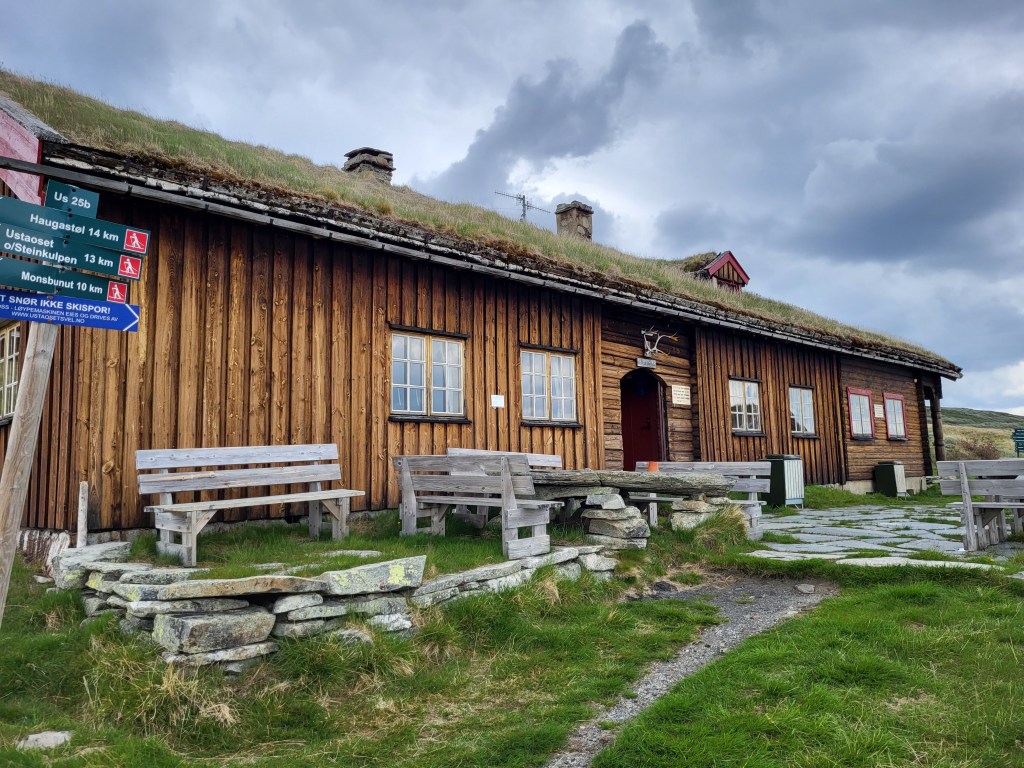 Um vier uhr bin ich schon wach, bleibe aber noch bis um fünf liegen, stehe dann auf und packe meine Sachen zusammen. Frühstücke meinen geliebten Haferbrei und bin um sechs Uhr auf dem Weg. Heute sind es nur 12 km bis zur Tuva Turisthytta. Eine privat geführte Hütte die vielleicht schon geöffnet hat. Die 12 km lassen sich locker angehen. Es geht auf drei Km Wegstrecke stetig bergauf. Leider wird der Weg auch immer felsiger und dadurch mühsamer zu gehen, aber ich komme trotzdem gut voran. Mache des öfteren kleine Pausen und genieße die Landschaft. Leider fängt es gegen 10 Uhr an zu regnen und zwar so heftig, dass ich meine Regenklamotten nicht schnell genug anziehen kann um trocken zu bleiben. Dann den Regenüberzug über den Rucksack gespannt und nach ein paar Minuten die Sonne schon wieder hervor. Ich lasse die Regenkleidung trotzdem an, da ich erstens zu faul bin um wieder anzuhalten und zweitens hat der Wetterdienst weitere Schauer angesagt die aber nicht mehr eintreffen. Gegen 10 Uhr kann ich die Hütte aus der Ferne erblicken. Ich versuche zu erkennen ob sie geöffnet hat oder sich dort leute aufhalten. Kann aber nichts erkennen, da ich noch zu weit weg bin. Erst beim Näherkommen erkenne ich auf einem höher gelegenen Parkplatz einige Autos. Gutes Zeichen denke ich. Dann nach weiteren 30 min. kann ich eine offene Tür entdecken und Menschen davor. Ich freu mir ein Loch in den Bauch. Eine bewirtschaftete Hütte und geöffnet. Gegen 11 Uhr erreiche ich das Anwesen, trete ein und frag den Wirt ob er noch ein Bett für mich frei hätte. Hat er! Er erklärt mir, dass sie heute erst geöffnet haben. Was für ein Glücksfall. Ich lass mir die Kammer zeigen, die Duschen und Toiletten und bevor ich die Kammer beziehe, bestelle ich mir erstmal einen Kaffee, eine Waffel und zwei Zimtschnecken, die mich von der Auslage verführerich hypnotisierend anlachen. Und schon geht’s mir wieder gut. Der Wirt erklärt mir, dass seine Frau deutschstämmig sei und sehr gut deutsch spricht. Ihr Vater sei deutscher und habe diese Hütte lange geführt und sie vor einiger Zeit an die Tochter übergeben. Ich freue mich dass ich mich wieder in deutsch unterhalten kann. Später kommt der Vater noch kurz an der Hütte vorbei und wir unterhalten uns . Er erzählt mir, dass er 1975 nach Norwegen gekommen sei und dieses Anwesen, was damals noch ein Hof gewesen sei gekauft hat und den Hof zu einer gutgehenden Wander und Skihütte umgebaut habe. Sie hätten zweimal im Jahr Saison. Einmal Wintersaison in der viele Skilangläufer vorbeikämen und in der Sommersaison viele Wanderer und Angler bewirtet werden. Wärend er mir so seine Geschichte erzählt verpüre ich große Lust auf ein gekühltes Bier vom Fass und gönne mir zwei halbe für je 10 € . Der gute Mann fragt wie ich denn nun weiter verfahren möchte und ich erkläre ihm dass ich morgen erst mal nach Geilo zum Campingplatz wolle um dort drei Tage lang auszuruhen und dann eine Entscheidung treffen will, ob ich nun die Tour abbreche oder weitergehen will. Denn mein gesundheitlicher Zustand hat sich weiterhin nicht gebessert und die depressive Verstimmung will einfach nicht weichen. Mal bin ich Himmelhochjauchzend vor Glück diese Wanderung zu machen um im gleichen Augenblick wieder in ein tiefes Loch zu fallen. Unter diesen Umständen kann ich auf gar keinen Fall die Tour weitergehen. Aber das entscheide ich nicht jetzt und nicht hier in der Hütte. Dafür nehm ich mir Zeit von Sonntag bis Dienstag in Geilo in einer Campinghütte.